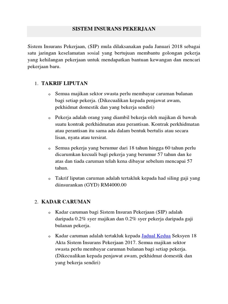 . Up to 3 cash back Open navigation menu. Close suggestions Search Search. Secara asasnya Sistem Insurans Pekerjaan SIP atau Employee.